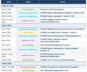 PCSNM is excited to announce the upcoming timeline for Round Four of the NMCSP subgrant competition! Round Four will include the availability of 8 subgrant awards: 4 expansion subgrant awards of $1.5 million each, 1 replication grant of $2 million, and 3 new school subgrant awards of $2 million each. Round Four will also include the launch of The Mind Trust (TMT) Fellowship, a growth and expansion capacity-building program for charter school leaders that will support CSP subgrantees pre and post award.